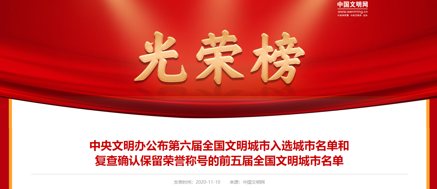 2020年8月以來(lái),中央文明辦按照城市自主申報(bào)、省級(jí)擇優(yōu)推薦、中央部委審核、媒體集中公示、組織綜合測(cè)評(píng)、確定入選城市等評(píng)選辦法和程序,嚴(yán)謹(jǐn)規(guī)范組織第六屆全國(guó)文明城市評(píng)選工作,嚴(yán)格依據(jù)參評(píng)城市2018、2019、2020年三年測(cè)評(píng)總成績(jī)排名,提出第六屆全國(guó)文明城市入選城市名單,報(bào)中央文明委領(lǐng)導(dǎo)同志批準(zhǔn)。同時(shí),中央文明辦按照城市自查、省級(jí)審核、中央把關(guān)、組織測(cè)評(píng)等復(fù)查辦法和程序,認(rèn)真做好前五屆全國(guó)文明城市復(fù)查工作,嚴(yán)格依據(jù)全國(guó)文明城市復(fù)查測(cè)評(píng)成績(jī),提出繼續(xù)保留榮譽(yù)稱(chēng)號(hào)的全國(guó)文明城市名單,報(bào)中央文明委領(lǐng)導(dǎo)同志批準(zhǔn)?,F(xiàn)將第六屆全國(guó)文明城市入選城市名單和復(fù)查確認(rèn)保留榮譽(yù)稱(chēng)號(hào)的前五屆全國(guó)文明城市名單公布如下。
