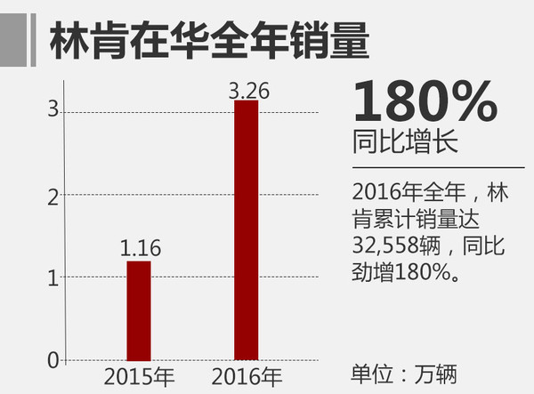 在陸續(xù)引入四款新車后,隨著產(chǎn)品線的逐漸豐富,開始走“親民”路線的林肯在重回中國市場后銷量大幅攀升。較之2015年的11,630輛,2016年全年林肯累計(jì)銷量達(dá)32,558輛,同比勁增180%,其增速成為中國成長最快的豪華品牌。在第四季度,林肯單月銷量達(dá)11,562輛,占全年銷量的35.5%,同比增幅162%。