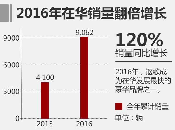 由于此前在華的產(chǎn)品投入等多方問題,入華已經(jīng)達(dá)到10年的本田高端品牌謳歌,銷量并沒有得到顯著提升,2015年謳歌在中國市場的新車上牌量僅為4,100輛,數(shù)據(jù)并不美麗。2016年謳歌重整旗鼓,制定完善的在華戰(zhàn)略,推出首款國產(chǎn)車型CDX后其銷量得到明顯提升,2016年累計(jì)售出9,062輛,同比大增120%,成為增速第二快的豪華品牌。