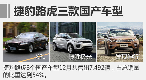 捷豹路虎去年能夠超越自我,實現(xiàn)新的銷量記錄,國產(chǎn)車型成為最重要因素。剛剛結(jié)束的2016年12月,捷豹路虎在華共售出13,859輛,與2015年同期(10,227輛)相比大漲36%。其中,捷豹路虎在華合資公司生產(chǎn)的3款國產(chǎn)車型捷豹XFL、路虎極光、發(fā)現(xiàn)神行,12月共售出7,492輛,占總銷量的比重達(dá)到54%。