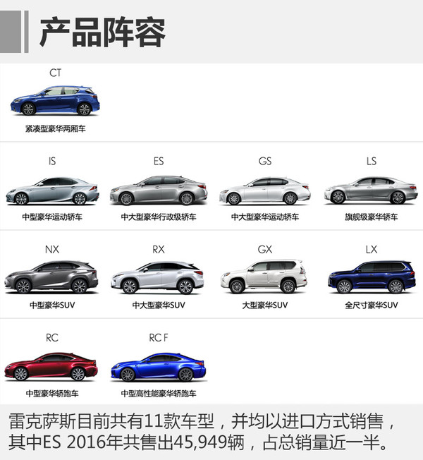 從產(chǎn)品上看,雷克薩斯主要銷量集中在ES、NX、RX這三款車型。其中作為“最暢銷車型”,ES 2016年全年共售出45,949輛,貢獻(xiàn)了近一半的銷量。