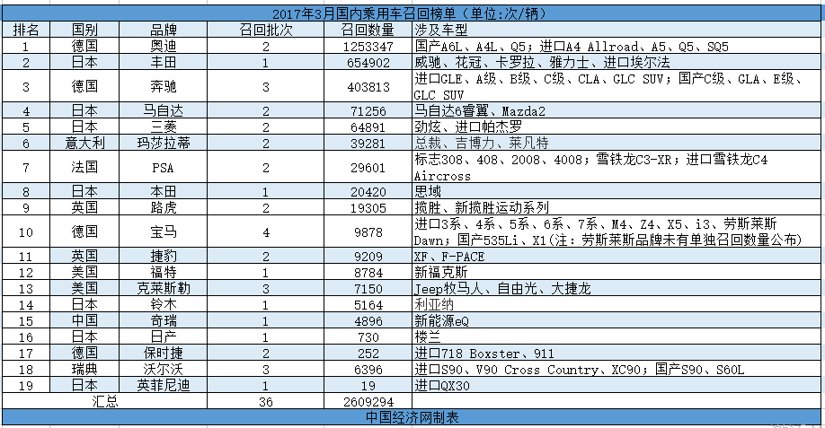 根據(jù)國家質(zhì)檢總局缺陷產(chǎn)品管理中心3月份發(fā)布的召回公告,中國經(jīng)濟(jì)網(wǎng)汽車頻道經(jīng)過匯總、統(tǒng)計(jì),整理出“3月國內(nèi)乘用車召回榜單”。3月份,中國汽車市場(chǎng)內(nèi)共有21個(gè)汽車品牌發(fā)布了累計(jì)36次召回公告,共計(jì)召回2609294輛汽車。