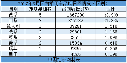 從國別情況來看,3月,德系共5個(gè)品牌召回車輛1667290輛,占召回總量的63.9%;日系共7個(gè)品牌召回汽車817382輛,占比31.33%;法系、英系和美系各有2個(gè)品牌發(fā)布召回召回公布,分別召回汽車29601輛、28514輛、15934輛,占比分別為1.13%、1.09%、0.61%;其余,意大利、瑞典以及自主各有一個(gè)品牌發(fā)布召回公告,合計(jì)占召回總量的1.95%。
