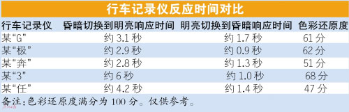 此次測(cè)試,車天下君準(zhǔn)備一個(gè)“黑盒子”,里面放置一個(gè)屏幕常亮的智能手機(jī)。在“黑盒子”外面,放置另外一個(gè)屏幕常亮的智能手機(jī)。切換時(shí)間控制在0.3秒之內(nèi),分為“明到暗”和“暗到明”兩個(gè)環(huán)節(jié),記錄行車記錄儀場景切換時(shí)的響應(yīng)時(shí)間。由測(cè)試結(jié)果一覽表可以看到,參與測(cè)試5個(gè)型號(hào)的行車記錄儀的響應(yīng)時(shí)間都不盡相同:短則1秒,長則6秒。車天下君歸納如下,質(zhì)量合格的行車記錄儀從昏暗切換到明亮環(huán)境的響應(yīng)時(shí)間應(yīng)在3~4秒之間,從明亮切換到昏暗環(huán)境當(dāng)中的響應(yīng)時(shí)間應(yīng)該在1~2秒之內(nèi)。