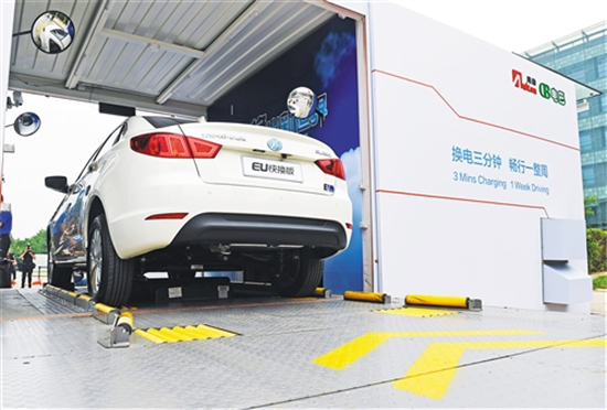 7月5日,北汽新能源首款對私換電車型在換電站樣板間展示如何快速換電。 新華社記者 羅曉光攝