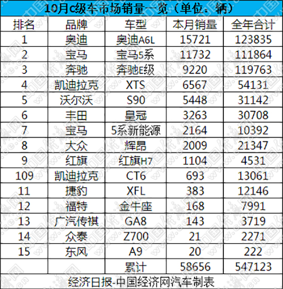 統(tǒng)治C級車市場近30年的奧迪A6L,即便處在產品生命期末端,依舊不減“老大”的霸氣。數(shù)據(jù)顯示,A6L在10月份的銷量達15721輛,勇奪單月銷量冠軍;前10個月的累計銷量為123835輛,趕超奔馳E級,重新收獲C級車市場的銷量冠軍。