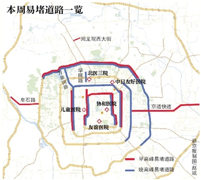 隨著近期氣溫下降,感冒等季節(jié)性疾病高發(fā),各大醫(yī)院就診人數(shù)增多,朝陽安貞地區(qū)、西城月壇地區(qū)、東城王府井地區(qū)的交通壓力較大,預(yù)計(jì)工作日上午時(shí)段,兒童醫(yī)院、協(xié)和醫(yī)院、中日友好醫(yī)院、友誼醫(yī)院、北醫(yī)三院等醫(yī)院就診人數(shù)增多,周邊交通壓力較大。