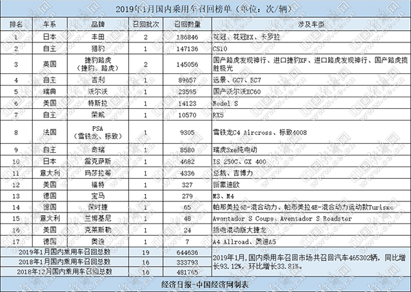 根據(jù)國家市場監(jiān)督管理總局缺陷產(chǎn)品管理中心1月份發(fā)布的召回公告,經(jīng)濟(jì)日報(bào)-中國經(jīng)濟(jì)網(wǎng)汽車頻道經(jīng)過匯總、統(tǒng)計(jì),整理出“2019年1月國內(nèi)乘用車召回榜單”。1月,國內(nèi)乘用車市場發(fā)布19起召回公告,共涉及19個品牌的644636輛汽車,同比增長93.12%,環(huán)比增長33.81%。