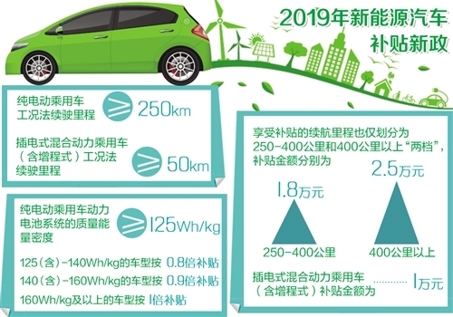 2019年新政提出:純電動乘用車工況法續(xù)駛里程不低于250公里,插電式混合動力乘用車(含增程式)工況法續(xù)駛里程不低于50公里,享受補貼的續(xù)航里程也僅劃分為250至400公里和400公里以上“兩檔”,補貼金額分別為1.8萬元和2.5萬元,插電式混合動力乘用車(含增程式)補貼金額為1萬元。