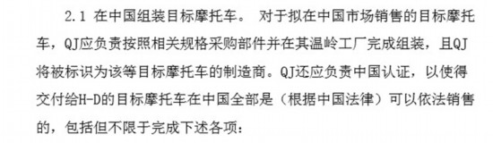 按協(xié)議,雙方將為中國和亞洲其他市場共同開發(fā)兩種不同的哈雷品牌優(yōu)質(zhì)摩托車:第一款暫時(shí)定為338cc排量(以下簡稱為目標(biāo)摩托車);在目標(biāo)摩托車的制造和組裝以及供應(yīng)鏈優(yōu)化方面進(jìn)行合作;在中國和亞洲其他市場銷售和營銷目標(biāo)摩托車進(jìn)行合作。