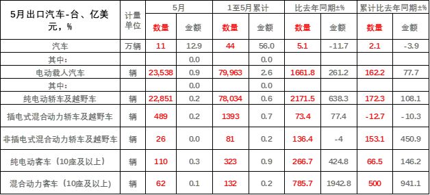 5月,我國出口汽車10.6萬輛,同比增長5.1%。其中,新能源汽車出口2.35萬輛,同比增長1661.8%。崔東樹認為,新能源汽車對車市實現(xiàn)高質(zhì)量增長具有一定的拉動作用,同時也是國內(nèi)汽車出口實現(xiàn)正增長的強大動力。