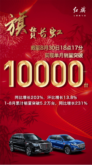 2019年8月30日18點(diǎn)17分,據(jù)紅旗官宣,紅旗品牌單月銷量已突破10000輛,同比增長203%,環(huán)比增長13.8%,至此,1-8月累計(jì)實(shí)現(xiàn)銷量5.2萬輛,同比增長231%。單月突破10000輛的成績,使紅旗首次躋身月銷萬輛俱樂部,這一極具里程碑意義的銷量數(shù)字,讓紅旗進(jìn)入了主流豪華品牌陣營,書寫了紅旗誕生61年來新的紀(jì)錄,也驗(yàn)證了紅旗正以氣貫長虹的勇猛之勢(shì),實(shí)現(xiàn)著全方位的“跨越”。