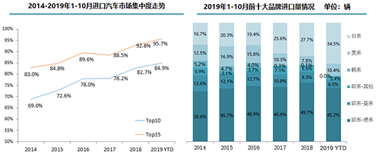 隨著品牌結(jié)構(gòu)的深度調(diào)整,進(jìn)口車市場(chǎng)品牌集中度持續(xù)提高。1-10月,進(jìn)口車前十大品牌占比達(dá)到84.9%,其中歐系品牌依然是絕對(duì)主力,德系占比達(dá)到45.2%,位居所有國(guó)別的第一位,但市場(chǎng)份額明顯下滑;作為第二大系別,日系在豐田、雷克薩斯的拉動(dòng)下,份額大幅提升至34.5%,較去年提高6.8個(gè)百分點(diǎn)。此外,美系品牌市場(chǎng)份額回升至10.4%,韓系品牌則徹底退出進(jìn)口車市場(chǎng)。