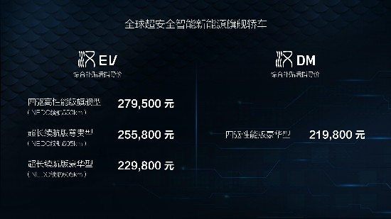 其中,漢EV超長續(xù)航版豪華型和漢EV超長續(xù)航版尊貴型NEDC綜合工況純電續(xù)駛里程為605公里;漢EV四驅(qū)高性能版旗艦型百公里加速3.9秒,是中國加速最快的量產(chǎn)新能源轎車;漢DM四驅(qū)性能版豪華型百公里加速4.7秒,是中國加速最快的插電混動轎車。