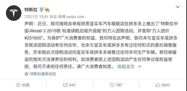 特斯拉在微博上對(duì)于拼多多“團(tuán)購”的聲明截圖。