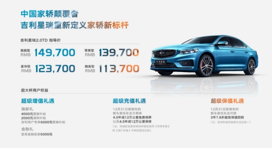 11月1日,吉利CMA超級母體首款寬體A級轎車——吉利星瑞于線上正式上市,新車全系標(biāo)配2.0TD+7DCT黃金動力系統(tǒng),共推出4款車型,官方指導(dǎo)價為11.37萬-14.97萬元。