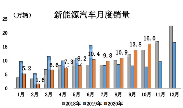 10月,新能源汽車產銷分別完成16.7萬輛和16萬輛,同比分別增長69.7%和104.5%,其單月產銷第四次刷新了當月歷史記錄。從細分能源類型來看,其中純電動汽車產銷分別完成14.1萬輛和13.3萬輛,同比分別增長72.4%和115.4%;插電式混合動力汽車產銷分別完成2.6萬輛和2.7萬輛,同比分別增長56.7%和63.7%;燃料電池汽車產銷分別完成77輛和79輛,同比分別增長1.3%和4.0%。