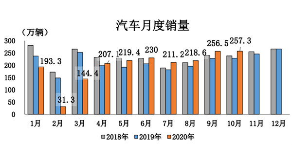 10月,汽車產銷分別完成255.2萬輛和257.3萬輛,環(huán)比分別增長0.9%和0.1%,同比分別增長11.0%和12.5%。截至本月,汽車產銷已連續(xù)7個月呈現(xiàn)增長,其中銷量已連續(xù)六個月增速保持在10%以上。