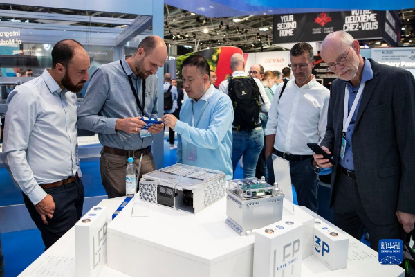 這是9月5日在德國慕尼黑國際車展的寧德時代展區(qū)拍攝的神行超充電池展品。