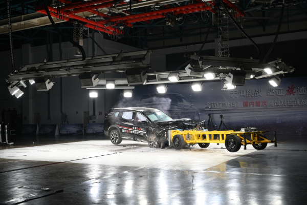 本次碰撞試驗(yàn),在中國(guó)汽車技術(shù)研究中心實(shí)車碰撞實(shí)驗(yàn)室進(jìn)行。經(jīng)過(guò)鹽水噴淋試驗(yàn)后的全新紅旗HS7與試驗(yàn)臺(tái)車,以100km/h的相對(duì)速度,進(jìn)行車輛正面副駕駛側(cè)50%對(duì)碰。