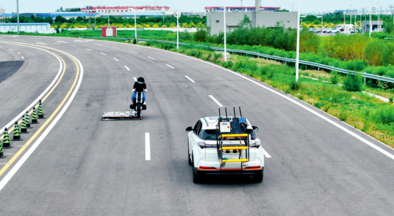 測試車輛在天津(西青)國家級車聯(lián)網(wǎng)先導區(qū)封閉測試場內(nèi)進行自動駕駛主動安全功能測試 (2024年6月14日攝) 孫凡越攝
