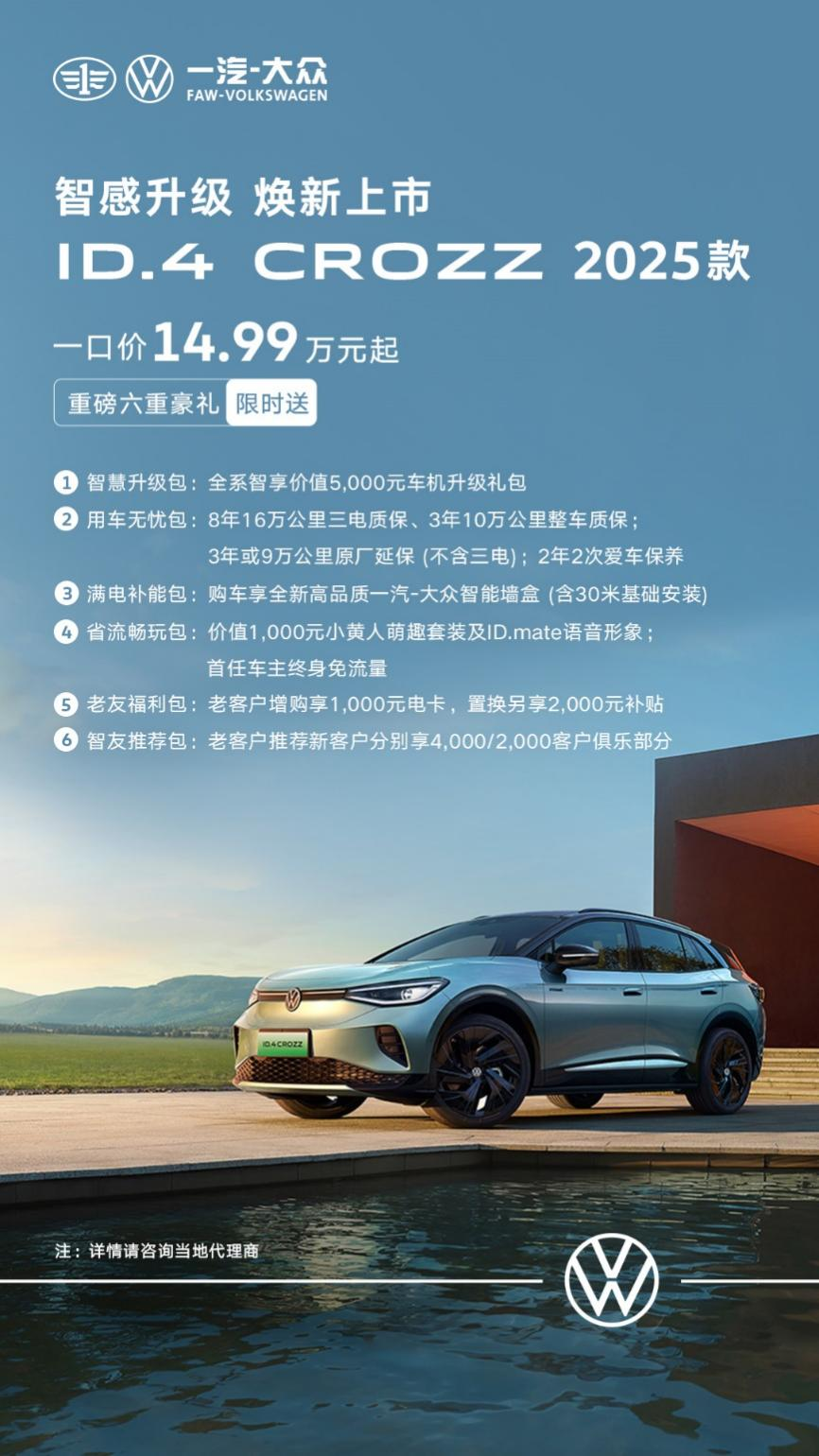 2025年1月3日,一汽-大眾ID.4 CROZZ 2025款正式上市,一口價14.99萬元起。此次煥新升級,ID.4 CROZZ 2025款在內(nèi)外飾設(shè)計、智能座艙、智能駕駛輔助、動力性能及舒適配置上實現(xiàn)了五大維度的全面升級,為消費者帶來全新的駕乘體驗。