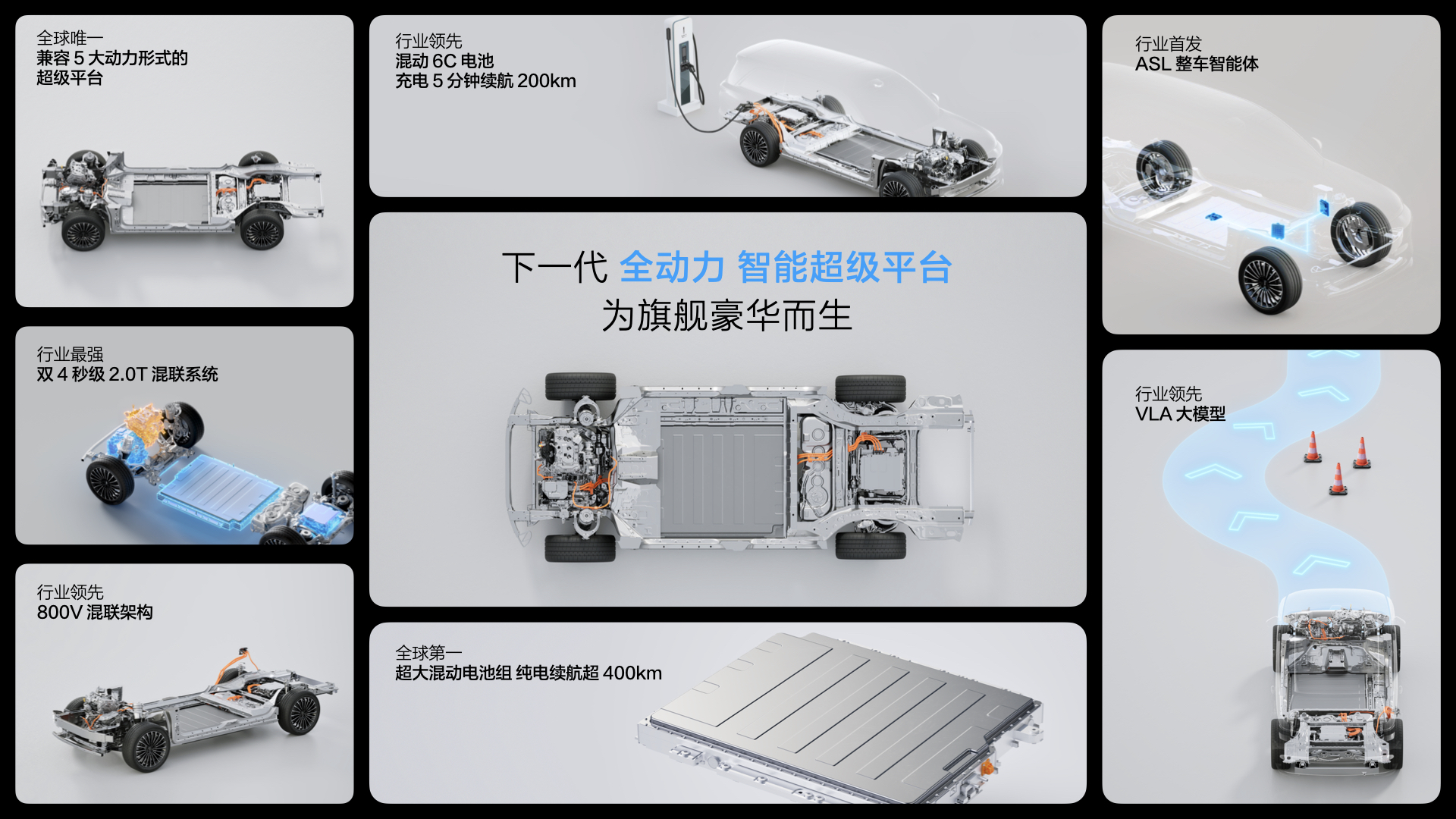 該平臺(tái)具備七大領(lǐng)先優(yōu)勢(shì),分別是,兼容5大動(dòng)力形式的超級(jí)平臺(tái);雙4s(秒)級(jí)2.0T超級(jí)混聯(lián)系統(tǒng);800V混聯(lián)架構(gòu);超大混動(dòng)電池組,純電續(xù)航超400km;混動(dòng)6C電池,充電5分鐘續(xù)航200km;行業(yè)首發(fā)的整車智能體以及行業(yè)領(lǐng)先的VLA大模型、