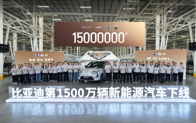 2025年12月18日,比亞迪第1500萬輛新能源汽車下線儀式在濟南工廠順利舉行,“大六座安全豪華SUV”騰勢N8L成為第1500萬輛下線車型,這也是騰勢N8L的第15000輛下線。比亞迪達(dá)成這一里程碑,用了整整17年,從1000萬到1500萬,只用了短短的13個月,再次刷新中國新能源汽車的“加速度”,也標(biāo)志著中國汽車工業(yè)正式邁入全球引領(lǐng)新階段。