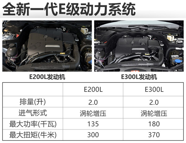 動力方面,新車將搭載兩款不同調(diào)校的2.0T渦輪增壓發(fā)動機(jī),其中E200L是沿用現(xiàn)款車型上的2.0T發(fā)動機(jī),最大功率135千瓦,最大扭計300牛米;E300L發(fā)動機(jī)則擁有更強的動力,最大功率180千瓦,最大扭矩達(dá)到370牛米。