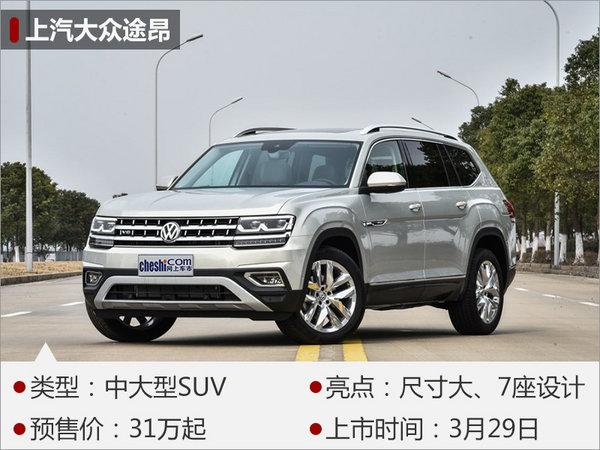 上汽大眾于2016年廣州車展發(fā)布了定位更高的中大型全新SUV-途昂(Teramont),新車將于今年3月29日正式上市。外觀上,新車采用全LED光源前大燈組、“W”型的日間行車燈,并與進氣格柵連為一體。內飾配置方面,新車擁有1.18平方米全景天窗、自適應巡航、駕駛模式選擇、12.3英寸液晶儀表等。大眾為途昂配備了2.0T(高/低功率)和2.5T V6渦輪增壓發(fā)動機,其中2.5T發(fā)動機的額定功率可達220kW,峰值扭矩500Nm,并提供四驅系統(tǒng)。