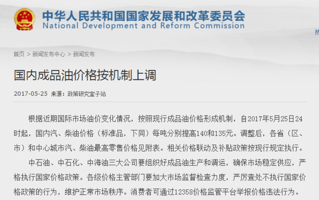 昨日(25日),國家發(fā)展和改革委員會發(fā)布消息稱,根據近期國際市場油價變化情況,按照現行成品油價格形成機制,自2017年5月25日24時起,國內汽、柴油價格(標準品,下同)每噸分別提高140和135元。相關價格聯動及補貼政策按現行規(guī)定執(zhí)行。