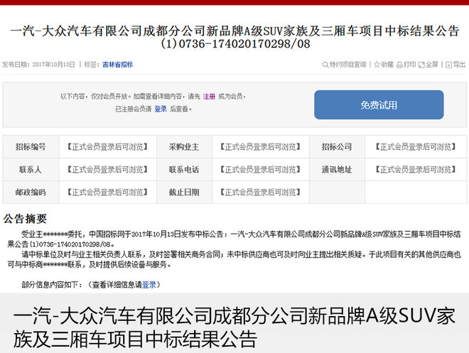 日前,中國(guó)招標(biāo)網(wǎng)正式公布了《一汽-大眾汽車有限公司成都分公司新品牌A級(jí)SUV家族及三廂車項(xiàng)目中標(biāo)結(jié)果公告》從公告上來(lái)看,一汽-大眾汽車有限公司正在成都工廠準(zhǔn)備新品牌A級(jí)SUV兩款車型以及另外一款三廂車項(xiàng)目。該項(xiàng)目主要用于投產(chǎn)一汽-大眾全新經(jīng)濟(jì)用車品牌,以滿足消費(fèi)者對(duì)廉價(jià)車的購(gòu)買(mǎi)需求。