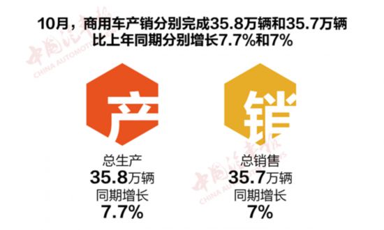 11月11日,中國汽車工業(yè)協(xié)會發(fā)布10月汽車產(chǎn)銷數(shù)據(jù)。商用車產(chǎn)銷分別完成35.8萬輛和35.7萬輛,比上月分別增長3.9%和4.8%,比上年同期分別增長7.7%和7%,與乘用車市場的“一片涼涼”相比,商用車產(chǎn)銷數(shù)據(jù)表現(xiàn)亮眼,市場加速回暖。 數(shù)據(jù)