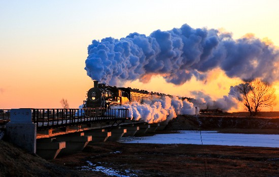 蒼茫原野上,汽笛的轟鳴打破寂靜,一列蒸汽機(jī)車緩緩而來(lái)。