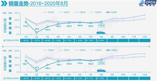 昨日(9月8日),乘用車市場信息聯(lián)席會發(fā)布數(shù)據(jù)顯示,8月,國內(nèi)狹義乘用車銷量達到170.3萬輛,同比增長8.9%,實現(xiàn)了自2018年5月以來的最強正增長。今年1-8月的零售累計增速下滑15.2%,較1-7月累計增速提升3.3個百分點,體現(xiàn)出行業(yè)的快速回暖態(tài)勢。