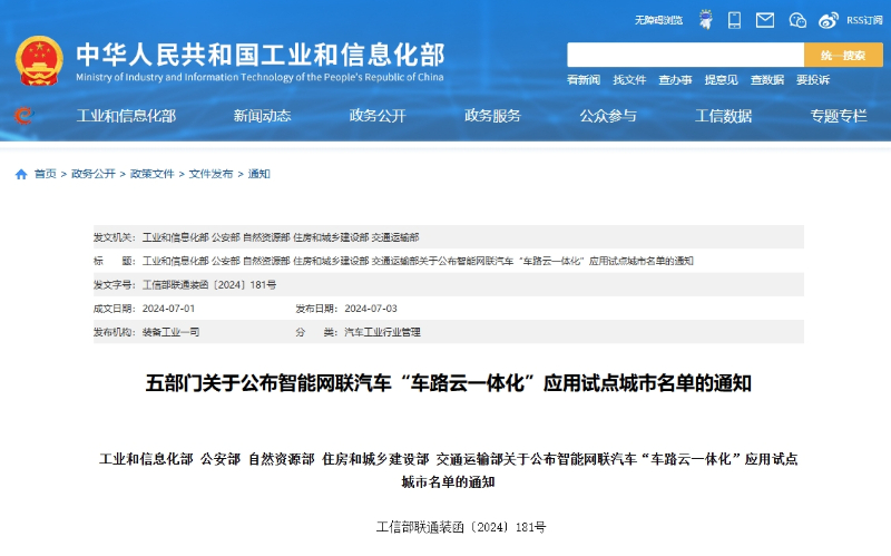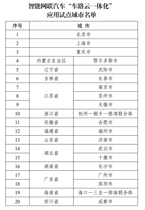 據(jù)工業(yè)和信息化部網(wǎng)站消息,近日,工業(yè)和信息化部、公安部、自然資源部、住房和城鄉(xiāng)建設(shè)部、交通運(yùn)輸部等五部門聯(lián)合公布智能網(wǎng)聯(lián)汽車“車路云一體化”應(yīng)用試點(diǎn)城市名單,20個(gè)城市(聯(lián)合體)榜上有名。