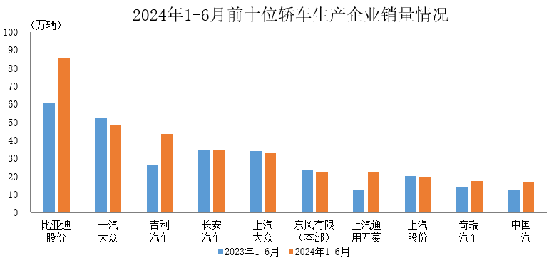 據(jù)中國汽車工業(yè)協(xié)會統(tǒng)計分析,2024年1-6月,銷量排名前十位的轎車生產(chǎn)企業(yè)共銷售345.7萬輛,占轎車銷售總量的67.8%。