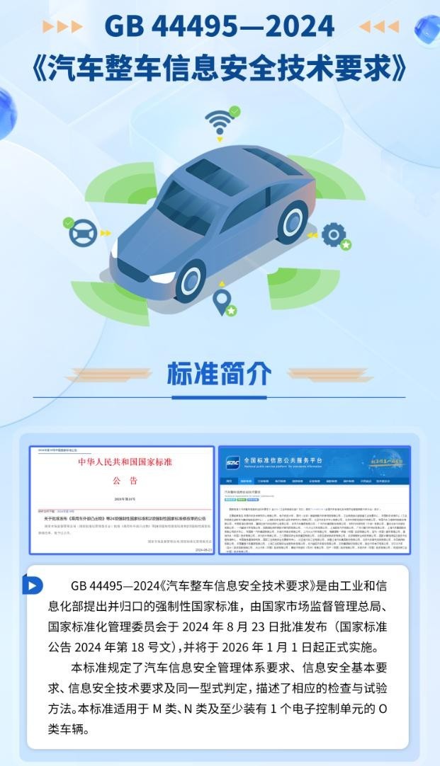 GB 44495—2024《汽車整車信息安全技術(shù)要求》規(guī)定了汽車信息安全管理體系要求,以及外部連接安全、通信安全、軟件升級安全、數(shù)據(jù)安全等方面的技術(shù)要求和試驗方法,適用于M類、N類及至少裝有1個電子控制單元的O類車輛,對于提升我國汽車產(chǎn)品的信息安全防護(hù)技術(shù)水平、強化產(chǎn)業(yè)鏈風(fēng)險防范和應(yīng)對網(wǎng)絡(luò)攻擊的能力、筑牢汽車信息安全防護(hù)基線具有重要意義。