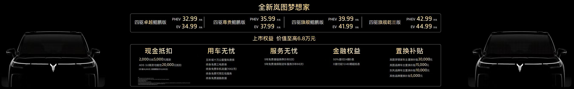 央廣網(wǎng)北京9月20日消息(記者 姜鵬)9月19日,以“感恩相伴 夢(mèng)想同行”為主題的東風(fēng)汽車感恩6000萬用戶相伴暨全新嵐圖夢(mèng)想家上市發(fā)布會(huì)于武漢成功舉辦,全新嵐圖夢(mèng)想家正式上市并公布價(jià)格,其中,全新嵐圖夢(mèng)想家四驅(qū)卓越鯤鵬版PHEV 32.99萬元、EV 34.99萬元;全新嵐圖夢(mèng)想家四驅(qū)尊貴鯤鵬版PHEV 35.99萬元、EV 37.99萬元;全新嵐圖夢(mèng)想家四驅(qū)旗艦鯤鵬版PHEV 39.99萬元、EV 41.99萬元;全新嵐圖夢(mèng)想家四驅(qū)旗艦乾崑版PHEV 42.99萬元、EV 44.99萬元。同時(shí),截至10月10日,嵐圖還為用戶提供至高6.8萬元的首銷期專享權(quán)益,包含2千元抵5千元現(xiàn)金抵扣,原價(jià)3萬首銷期僅需1萬元的ADS3.0高階智駕包;此外還有用車無憂、服務(wù)無憂、0息金融等權(quán)益;針對(duì)換購(gòu)的用戶還有至高3萬元的置換補(bǔ)貼。