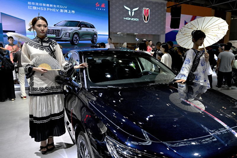 10月1日,在第44屆中國(福州)國際汽車博覽會暨第3屆中國(福州)國際智能網(wǎng)聯(lián)汽車體驗博覽會上,模特展示一款紅旗新車型。新華社記者 魏培全 攝
