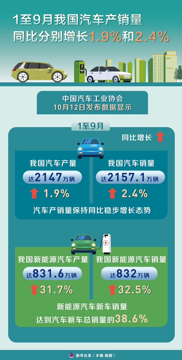 中國汽車工業(yè)協(xié)會12日發(fā)布數(shù)據(jù)顯示,1至9月,我國汽車產(chǎn)銷量達2147萬輛和2157.1萬輛,同比分別增長1.9%和2.4%,汽車產(chǎn)銷量保持同比穩(wěn)步增長態(tài)勢。