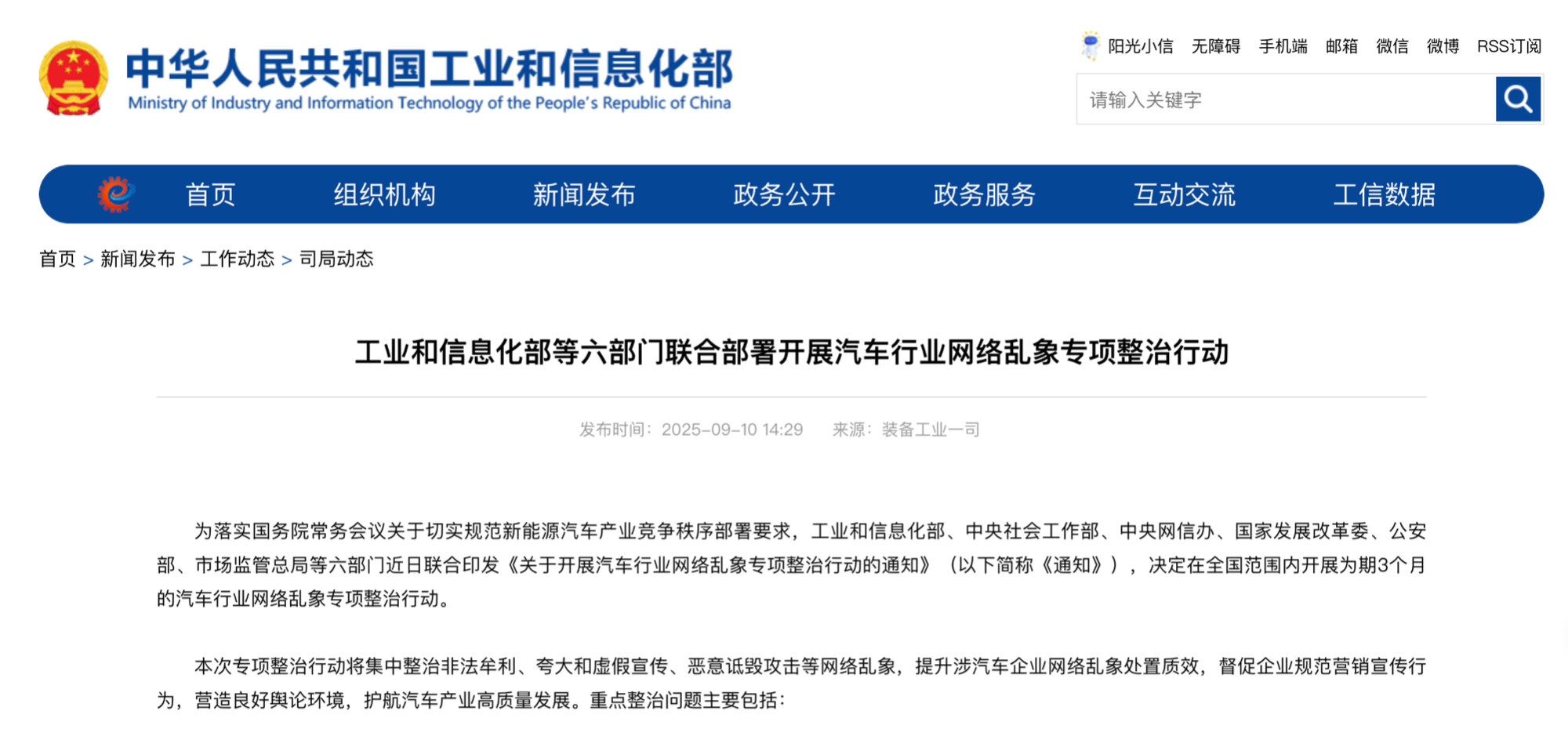 央廣網(wǎng)北京9月10日消息(記者董楠)9月10日,工業(yè)和信息化部(以下簡稱“工信部”)、中央社會工作部、中央網(wǎng)信辦、國家發(fā)展改革委、公安部、市場監(jiān)管總局等六部門聯(lián)合印發(fā)《關(guān)于開展汽車行業(yè)網(wǎng)絡(luò)亂象專項整治行動的通知》,決定在全國范圍內(nèi)開展為期3個月的汽車行業(yè)網(wǎng)絡(luò)亂象專項整治行動。 本次專項整治行動將集中整治非法牟利、夸大和虛假宣傳、惡意詆毀攻擊等網(wǎng)絡(luò)亂象,提升涉汽車企業(yè)網(wǎng)絡(luò)亂象處置質(zhì)效,督促企業(yè)規(guī)范營銷宣傳行為,營造良好輿論環(huán)境,護航汽車產(chǎn)業(yè)高質(zhì)量發(fā)展。