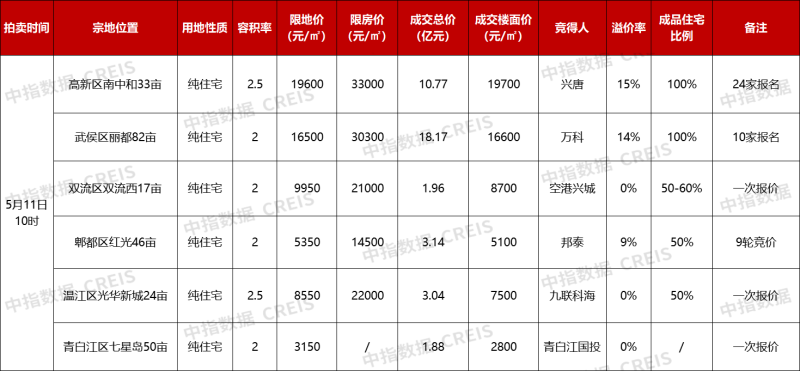 據(jù)中指研究院監(jiān)測(cè),本次出讓中,只有2宗宅地位于主城區(qū),其獲得關(guān)注熱度高、參拍企業(yè)多。最終,高新區(qū)南中和33畝宗地和武侯區(qū)麗都82畝宗地價(jià)格達(dá)到觸頂“熔斷”,分別由興唐地產(chǎn)和萬(wàn)科以樓面價(jià)19700元/平方米、16600元/平方米搖中。
