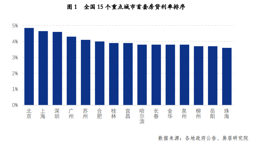 但具體看這15個城市的排序情況,各城市的實際首套房貸利率呈現(xiàn)了較大差異。其中北上深廣四個一線城市房貸利率最高,分別為4.85%、4.65%、4.60%和4.30%。而其他城市均低 4.1%的水平。易居房地產研究院統(tǒng)計顯示,有9個城市房貸利率低于4%的水平,包括弱二線城市和很多三四線城市。