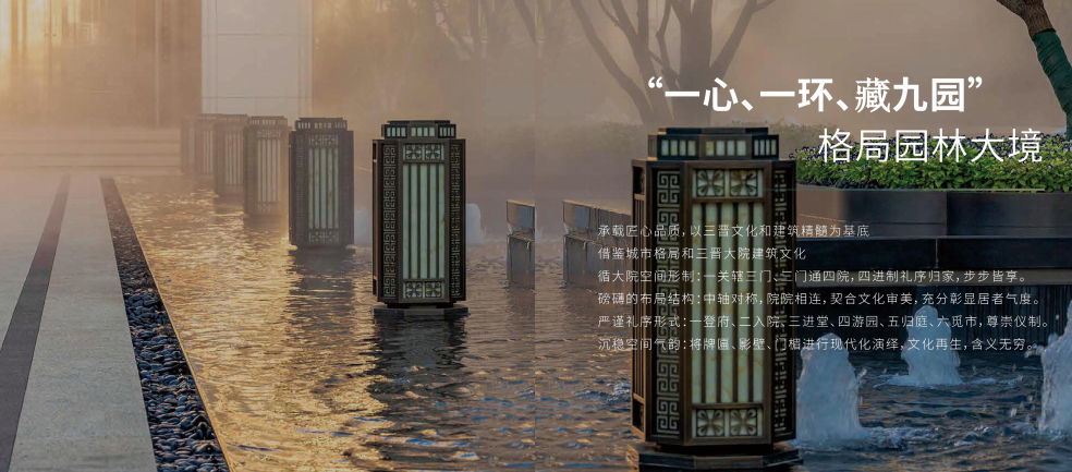 項目整體景觀設(shè)計以山林水源,禪意大宅為主線,將江南園林與皇家園林相結(jié)合,形成前府后院的園林形態(tài),景觀采用四級九景,四重栽植的造園手法,點綴了九個院落,四十個景點。園林鋪裝精致而具有設(shè)計感,在細(xì)節(jié)中加入特有的重視吉祥紋樣,更突出了新中式園林的設(shè)計風(fēng)格。