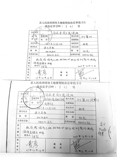 土地檔案中《國有土地使用權(quán)出讓審批卡片》與劉聚川提供的原件復(fù)印件對(duì)比。記者 朱旭東 攝