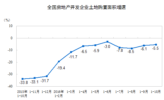 1-10月份,房地產(chǎn)開發(fā)企業(yè)土地購置面積16873萬平方米,同比下降5.5%,降幅比1-9月份收窄0.6個(gè)百分點(diǎn);土地成交價(jià)款6764億元,增長16.7%,增速提高3.4個(gè)百分點(diǎn)。