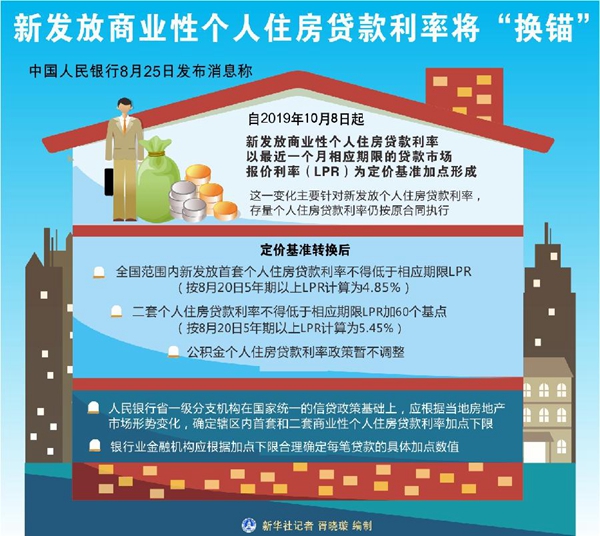 新華社北京8月25日電(記者張千千)中國人民銀行25日發(fā)布消息稱,自今年10月8日起,新發(fā)放商業(yè)性個人住房貸款利率以最近一個月相應期限的貸款市場報價利率(LPR)為定價基準加點形成。這一變化主要針對新發(fā)放個人住房貸款利率,存量個人住房貸款利率仍按原合同執(zhí)行。