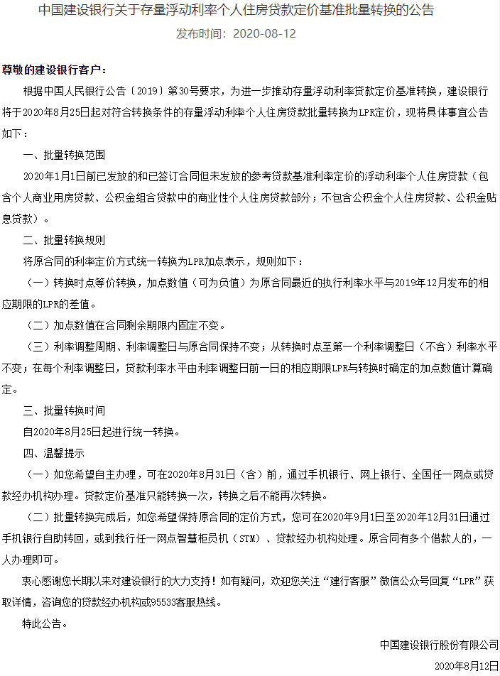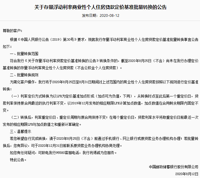 據(jù)悉,此前7月20日,交通銀行已經(jīng)發(fā)布公告,將于2020年8月21日對(duì)尚未轉(zhuǎn)換為貸款市場報(bào)價(jià)利率(LPR)或固定利率的存量浮動(dòng)利率房貸,統(tǒng)一調(diào)整為LPR浮動(dòng)利率加減點(diǎn)方式。
