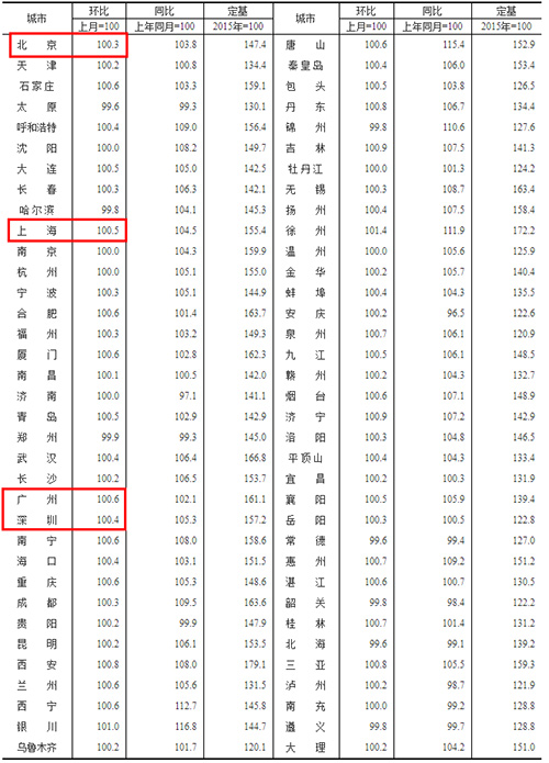 人民網北京10月20日電(記者孫紅麗)10月20日,國家統(tǒng)計局發(fā)布9月份商品住宅銷售價格變動情況統(tǒng)計數據。經初步測算,4個一線城市新建商品住宅銷售價格環(huán)比上漲0.4%,漲幅比上月回落0.2個百分點。其中,北京、上海、廣州和深圳分別上漲0.3%、0.5%、0.6%和0.4%。
